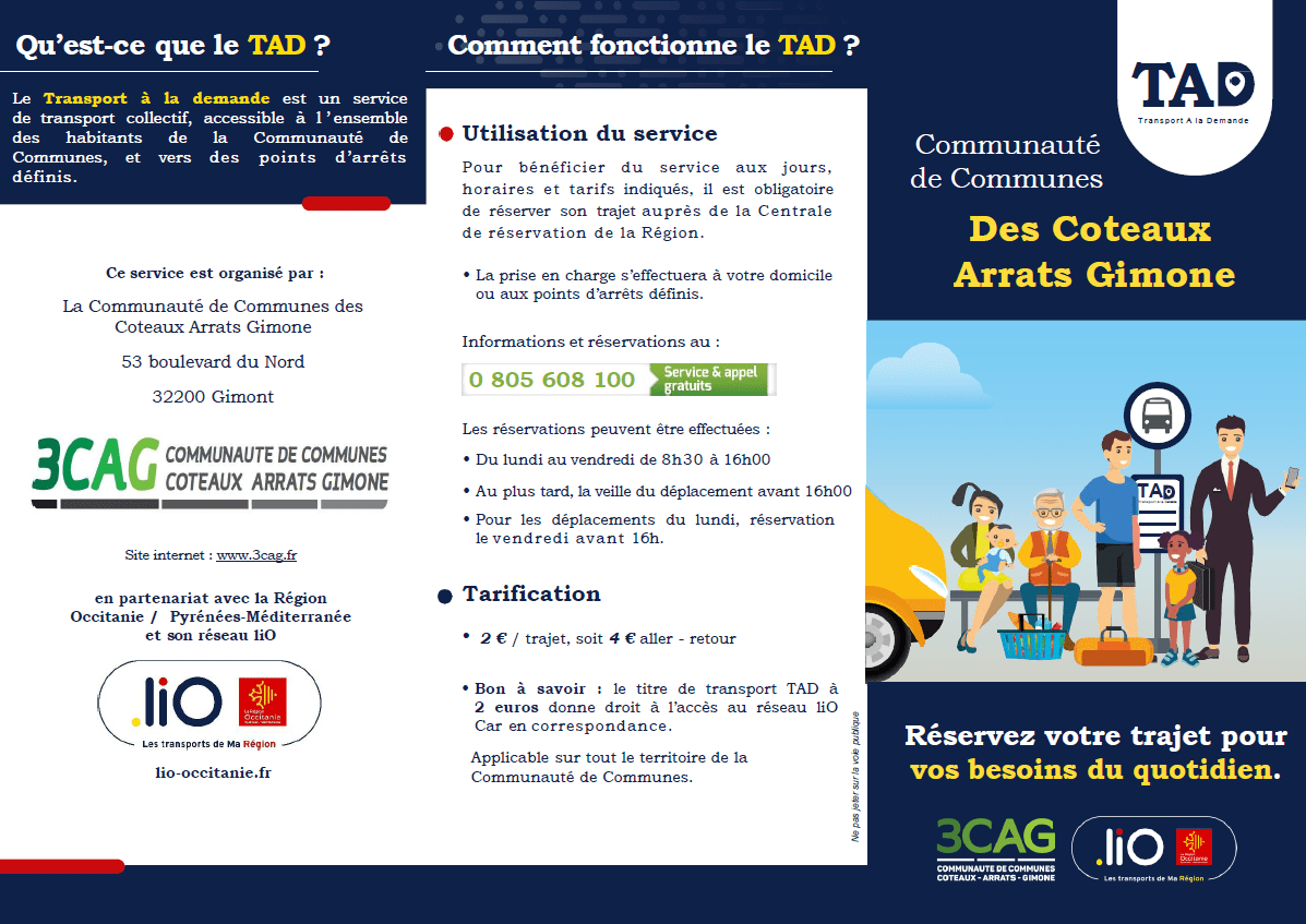 Le Transport à la demande (TAD) est un service de transport collectif, accessible à l’ensemble des habitants de la Communauté de Communes, et vers des points d’arrêts définis.